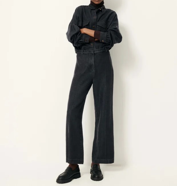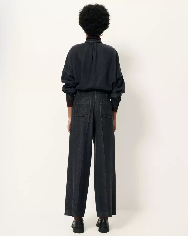 Pantalón de corte recto en sarga gruesa y fluida lavada a la piedra, tejido en España.