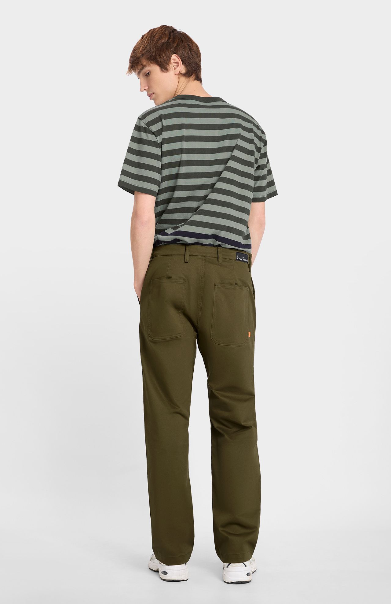 Pantalón de algodón tappered fit de tiro medio y cropt con cinturilla. Pinzas en la parte trasera. Cierre frontal con cremallera y botón. Bolsillos laterales y bolsillos plastrón en la espalda con detalle de cinta en contraste.
