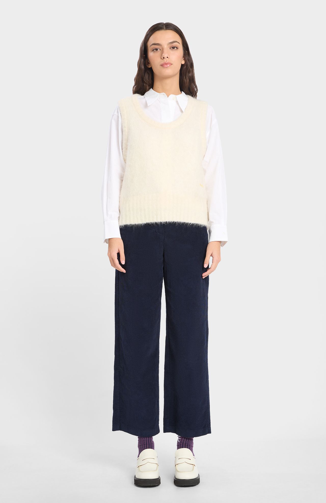 Chaleco con escote redondo y mangas sisa, perfecto para un look minimalista. El detalle bordado en el lateral inferior le da ese toque diferenciador, mientras que los acabados en rib mantienen el estilo limpio.